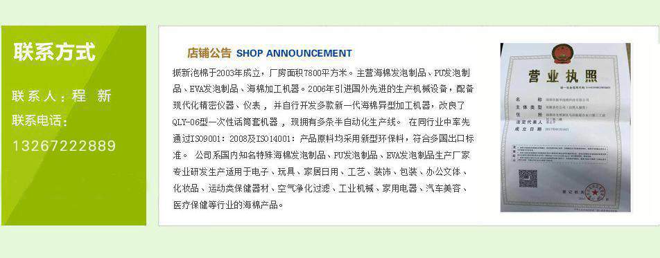 深圳市振新泡棉科技有限公司于2003年成立,廠房面積7800平方米。主營海棉發(fā)泡制品、PU發(fā)泡制品、EVA發(fā)泡制品、海棉加工機(jī)器。2006年引進(jìn)國外先進(jìn)的生產(chǎn)機(jī)械設(shè)備,配備現(xiàn)代化精密儀器、儀表 , 并自行開發(fā)多款新一代海棉異型加工機(jī)器,改良了QLY-06型一次性話筒套機(jī)器 , 現(xiàn)擁有多條半自動(dòng)化生產(chǎn)線。 我們擁有一批經(jīng)驗(yàn)豐富的工程技術(shù)人員和高級(jí)管理人員,在同行業(yè)中率先通過ISO9001:2008及ISO14001:產(chǎn)品原料均采用新型環(huán)保料,符合多國出口標(biāo)準(zhǔn)。 公司系國內(nèi)知名特殊海棉發(fā)泡制品、PU發(fā)泡制品、EVA發(fā)泡制品生產(chǎn)廠家,專業(yè)研發(fā)生產(chǎn)適用于電子、玩具、家居日用、工藝、裝飾、包裝、辦公文體、化妝品、運(yùn)動(dòng)類保健器材、空氣凈化過濾、工業(yè)機(jī)械、家用電器、汽車美容、醫(yī)療保健等行業(yè)的海棉產(chǎn)品。 產(chǎn)品的類型如:高密度聚酯海棉、普通海棉、異型定型海棉、防火/阻燃海棉、高回彈/慢回彈海棉、過濾網(wǎng)狀海棉、EVA玩具禮品、PU發(fā)泡定型玩具禮品等等。產(chǎn)品名稱如:耳機(jī)/話筒KTV海棉套、海棉圓球、洗刷海棉、吸水海棉、木漿海棉、化妝海棉、相機(jī)海棉、墨盒海棉、壓縮海棉、橡膠海棉、粗細(xì)孔過濾海棉、波峰隔音海棉、醫(yī)用海棉、海棉枕頭、包裝防震海棉、1mm厚海棉、電子/醫(yī)用海棉棉簽、EVA球、EVA智力拼圖、EVA鑰匙扣、PU座墊、PU公仔、PU球類等等。 我們還獲得多家國際知名廠商的授權(quán)資格,代理多品種家庭用品。 產(chǎn)品多年來一直銷往全球,深受廣大用戶和客商的青睞。